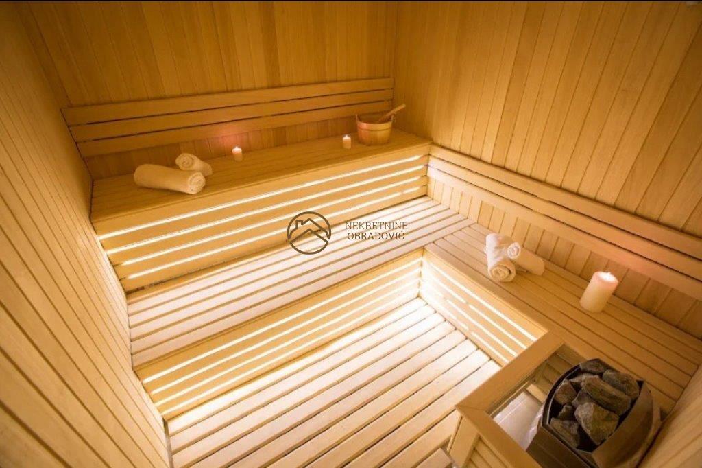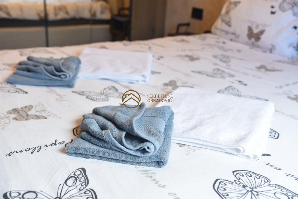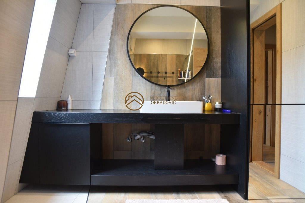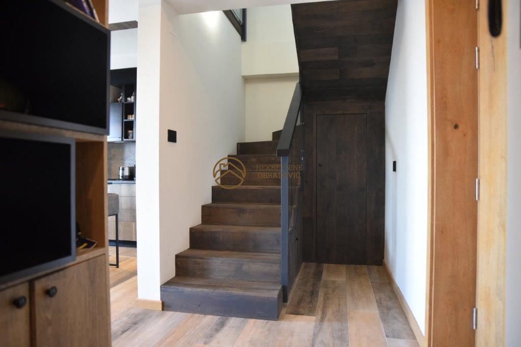 Ovaj apartman nudi vrhunski komfor, kvalitet i predivan pogled, cineci ga idealnim izborom za odmor i uzivanje. Prostrana dnevna soba sa izlazom na terasu pruza neodoljiv pogled na prirodu, dok su trpezarija i kuhinja opremljene najmodernijim uredajima visokog kvaliteta, ukljucujuci frizider za vino, zamrzivac, rernu i indukcione ploce. Kupatilo je moderno uredjeno, a spavace sobe nude toplinu i udobnost - jedna se nalazi u prizemlju, dok druga, smestena na galeriji, dodatno osvaja svojim spektakularnim pogledom.
