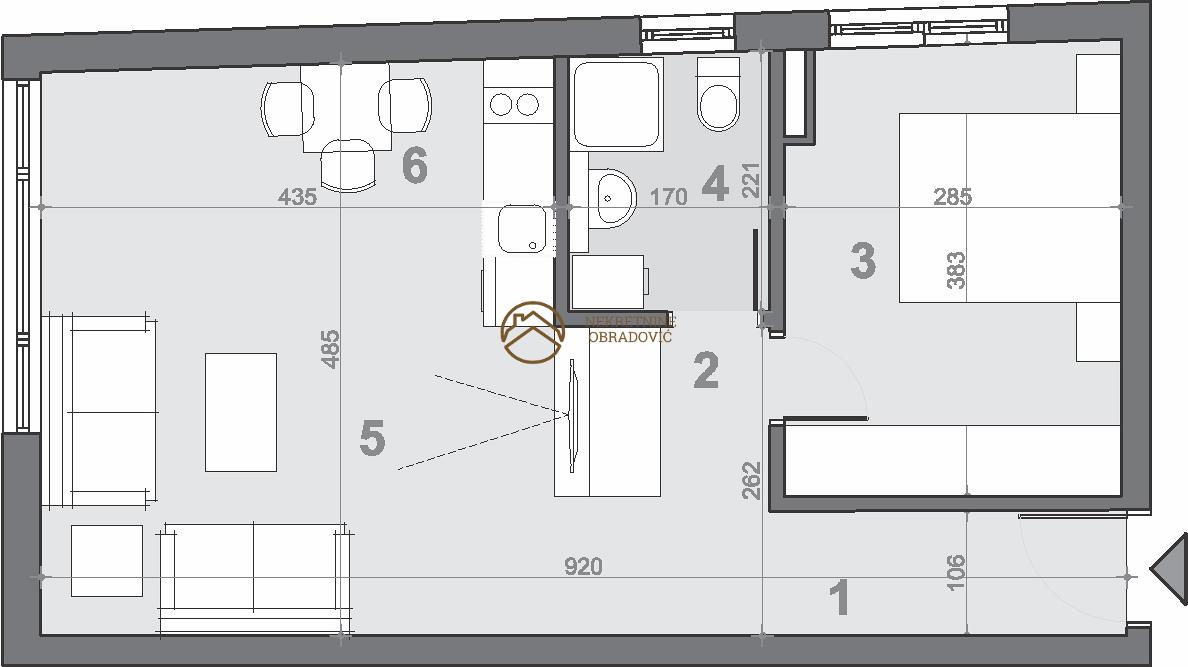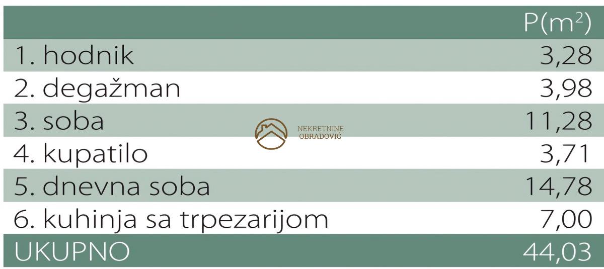 Dnevna soba, kuhinja sa trpezarijom, spavaca soba, kupatilo, hodnik, degazman.