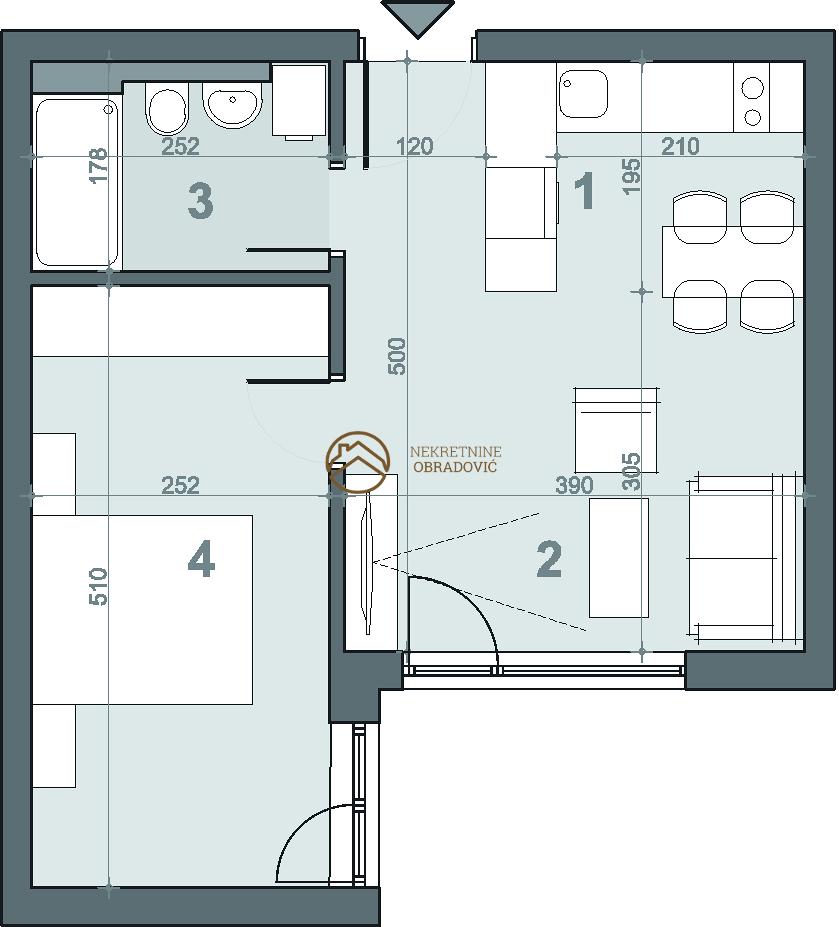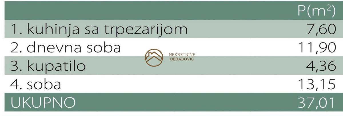 Dnevna soba, kuhinja sa trpezarijom, spavaca soba, kupatilo.