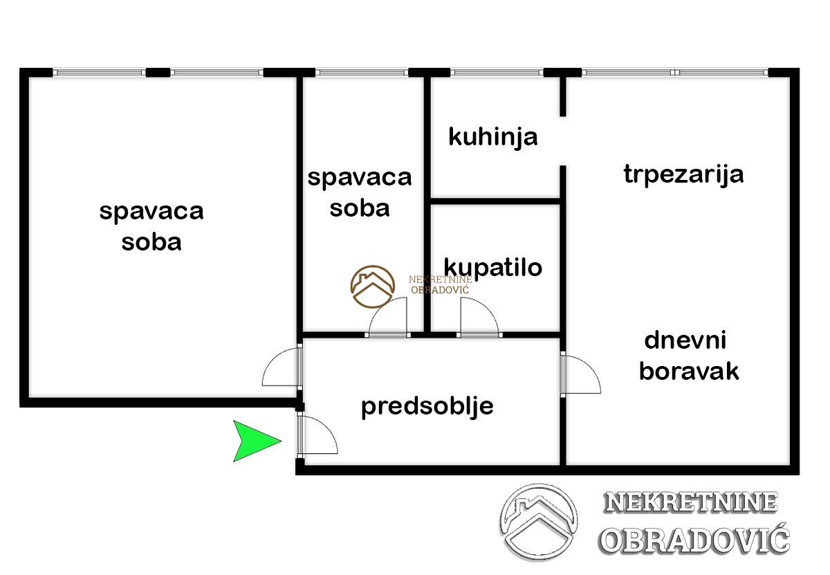 Dnevna soba sa trpezarijom, dve spavace sobe, kuhinja, kupatilo, hodnik.