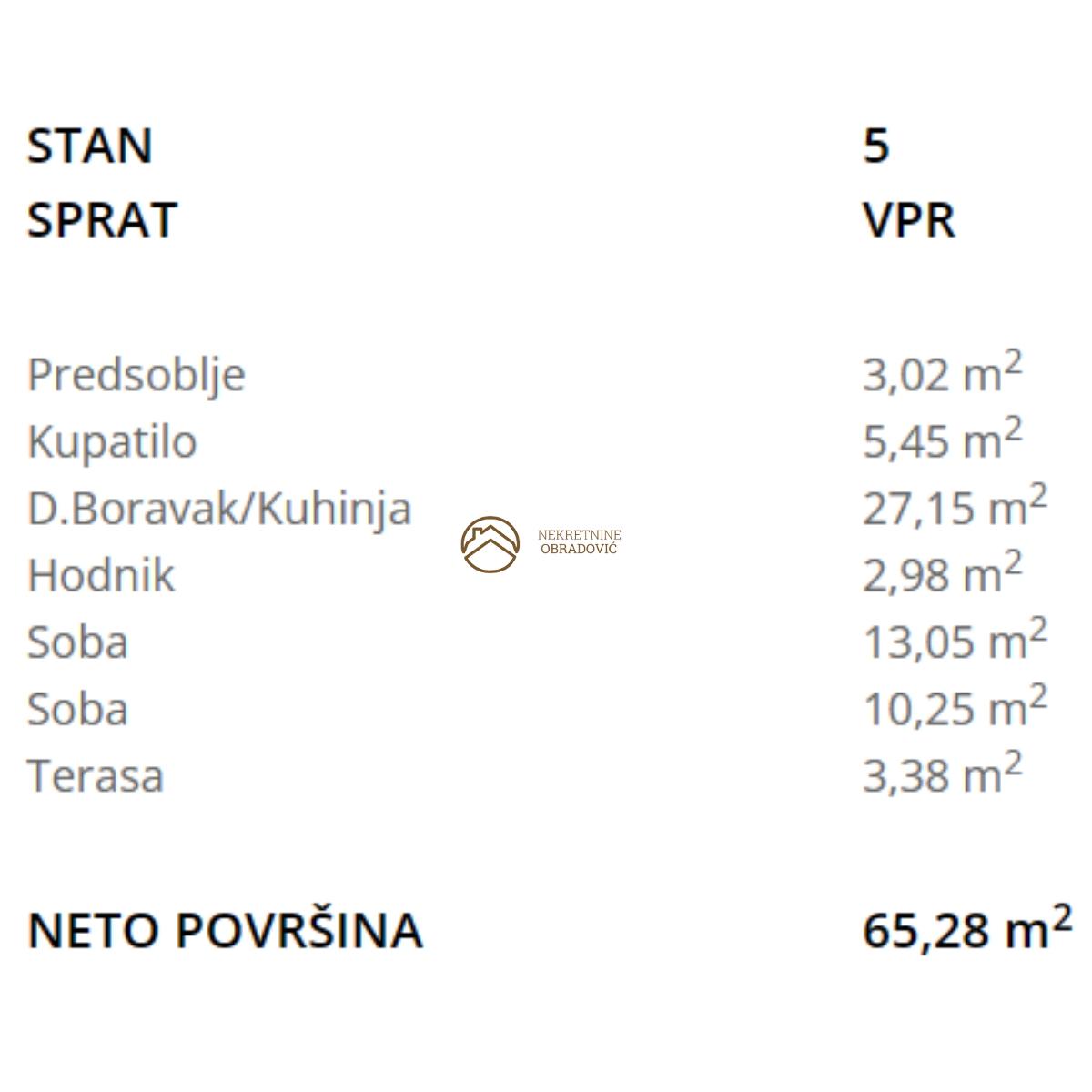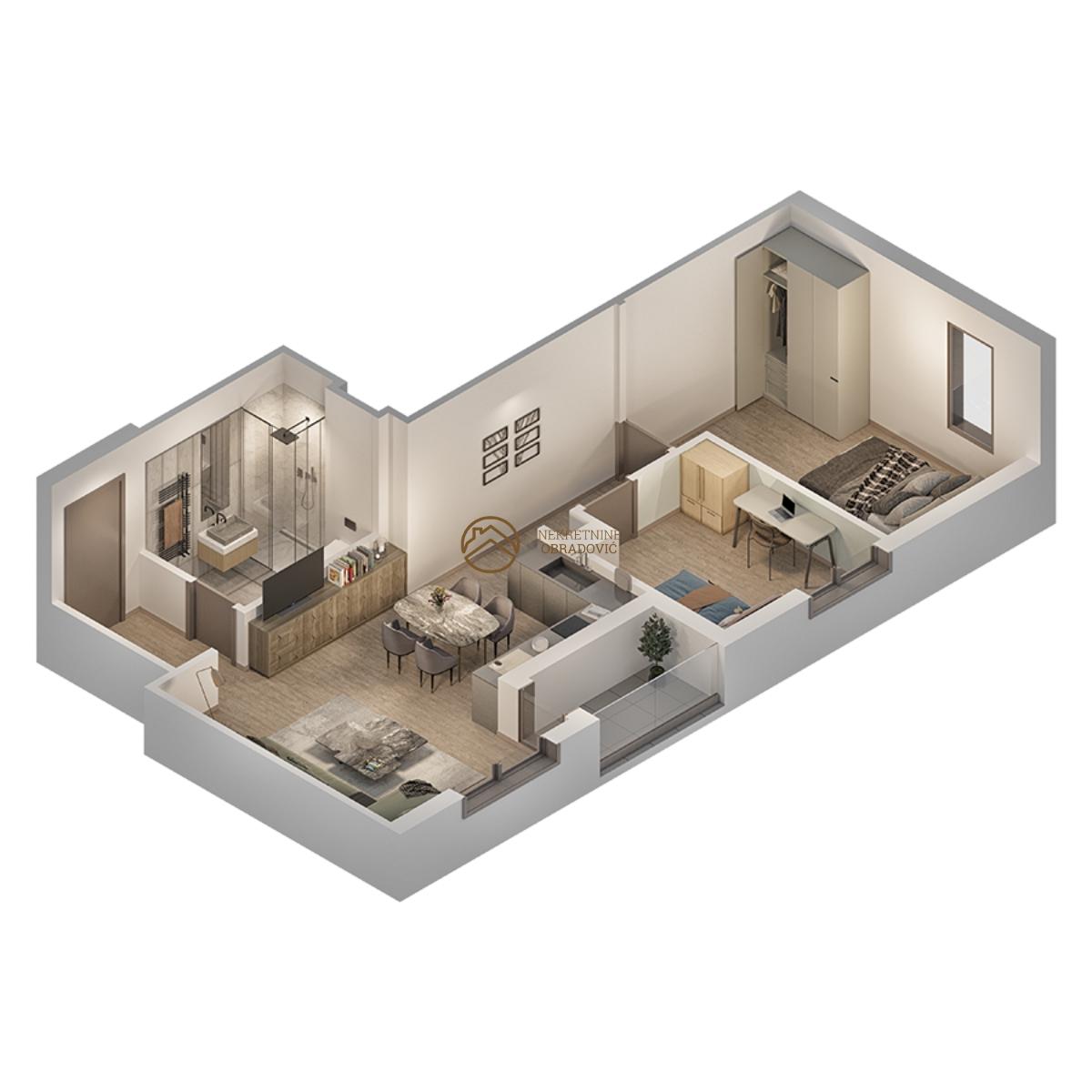 Dnevna soba sa trpezarijom, kuhinja, dve spavace sobe, kupatilo i terasa.