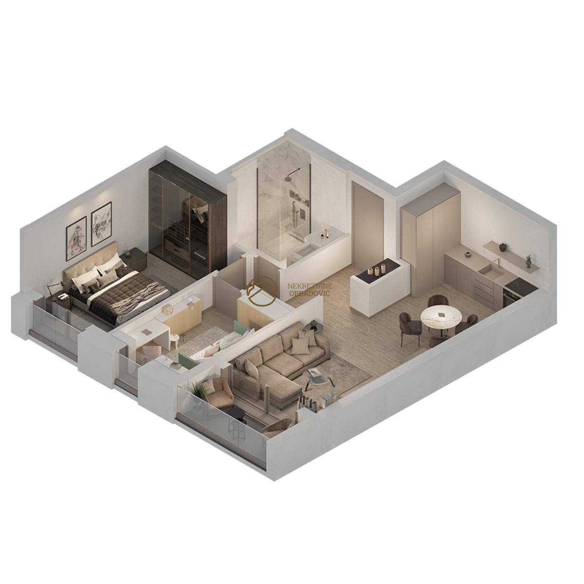 Dnevna soba sa trpezarijom, kuhinja, dve spavace sobe, kupatilo i terasa.