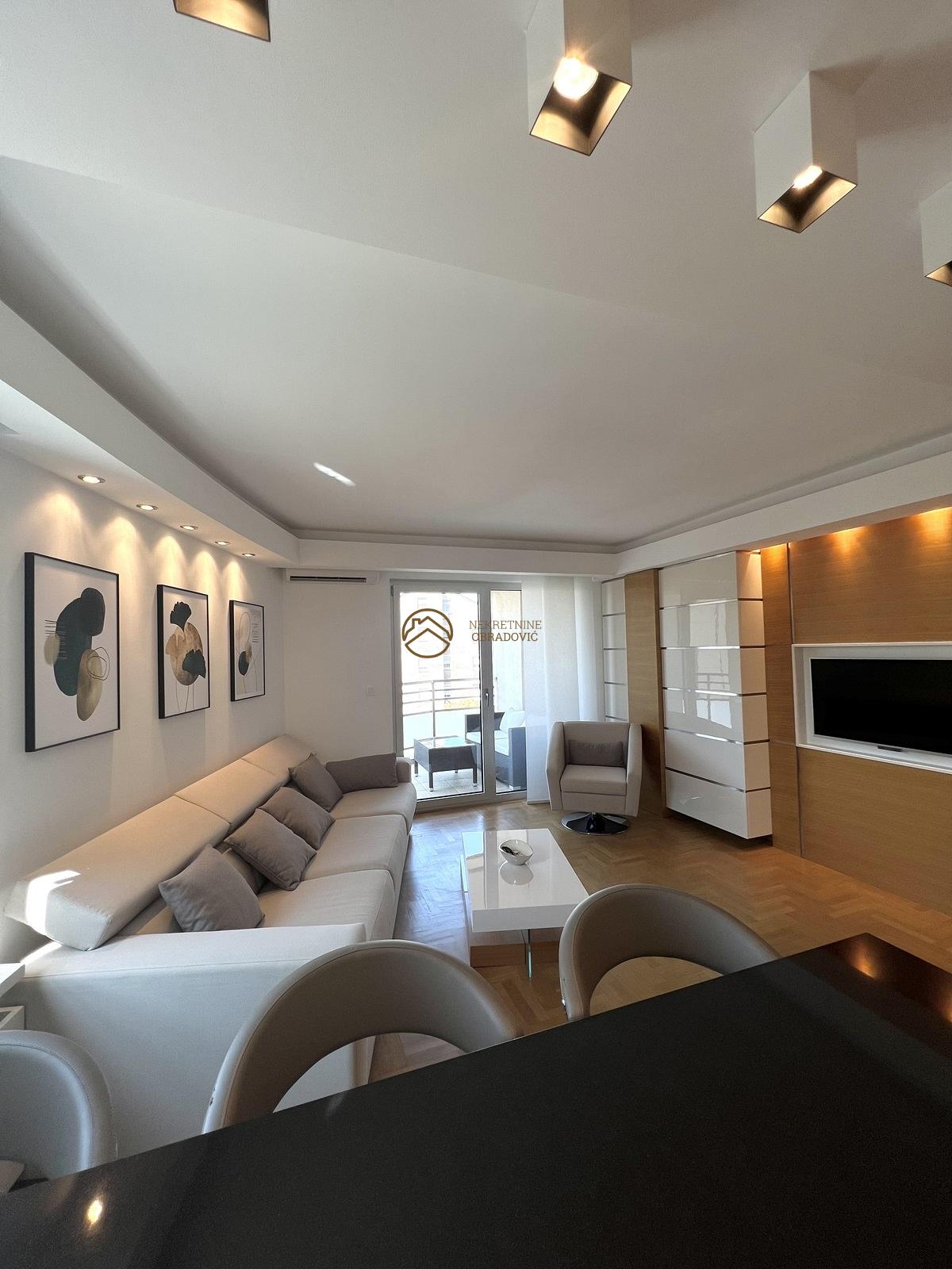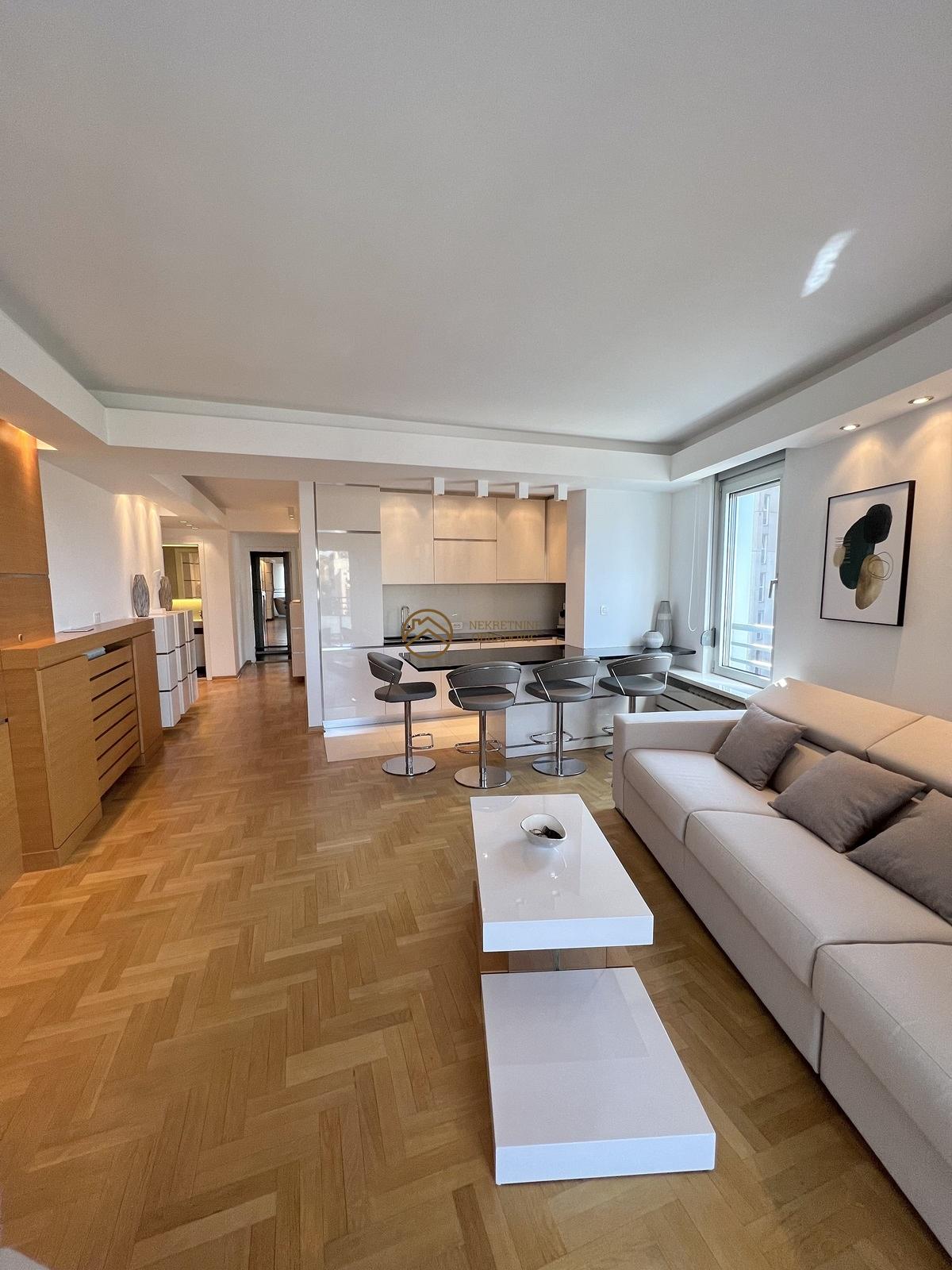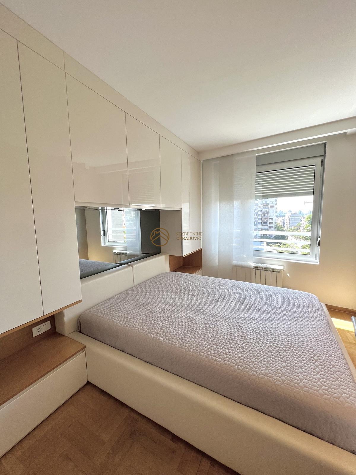 Nalazi u novogradnji iz 2014. godine i stan je u savrseno odrzavanom stanju, koji je minimalno koriscen. Sve u stanu je radjeno po meri i opremljen je najsavremenijim materijalima, tehnikom i aparatima i prodaje se u potpunosti namesten. Nalazi se u veoma kvalitetnoj zgradi, koja poseduje dva lifta, portira 24h i video nadzor. Uknjizen je na 68m2, sastoji se od ulaznog hodnika, kuhinje sa trpezarijom, dnevnog boravka, dve spavace sobe, kupatila, toaleta i terase. Stan je veoma osvetljen, sa odlicnim rasporedom, dvostrano orijentisan i sa pogledom na Hram Svetog Save.