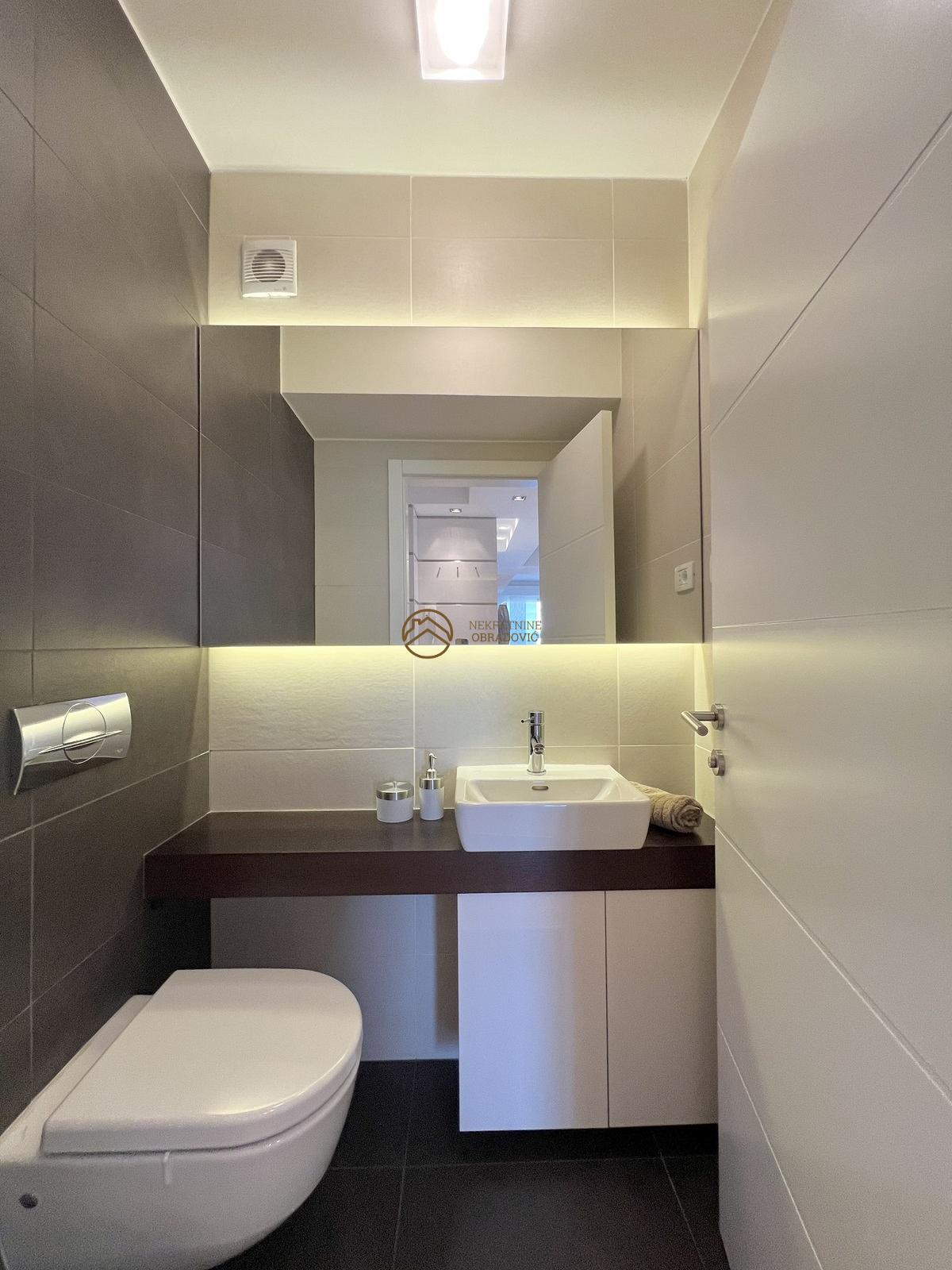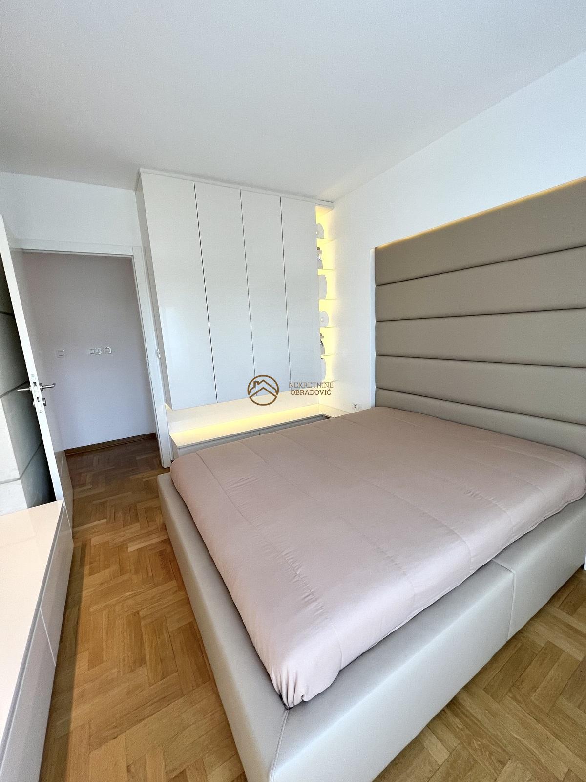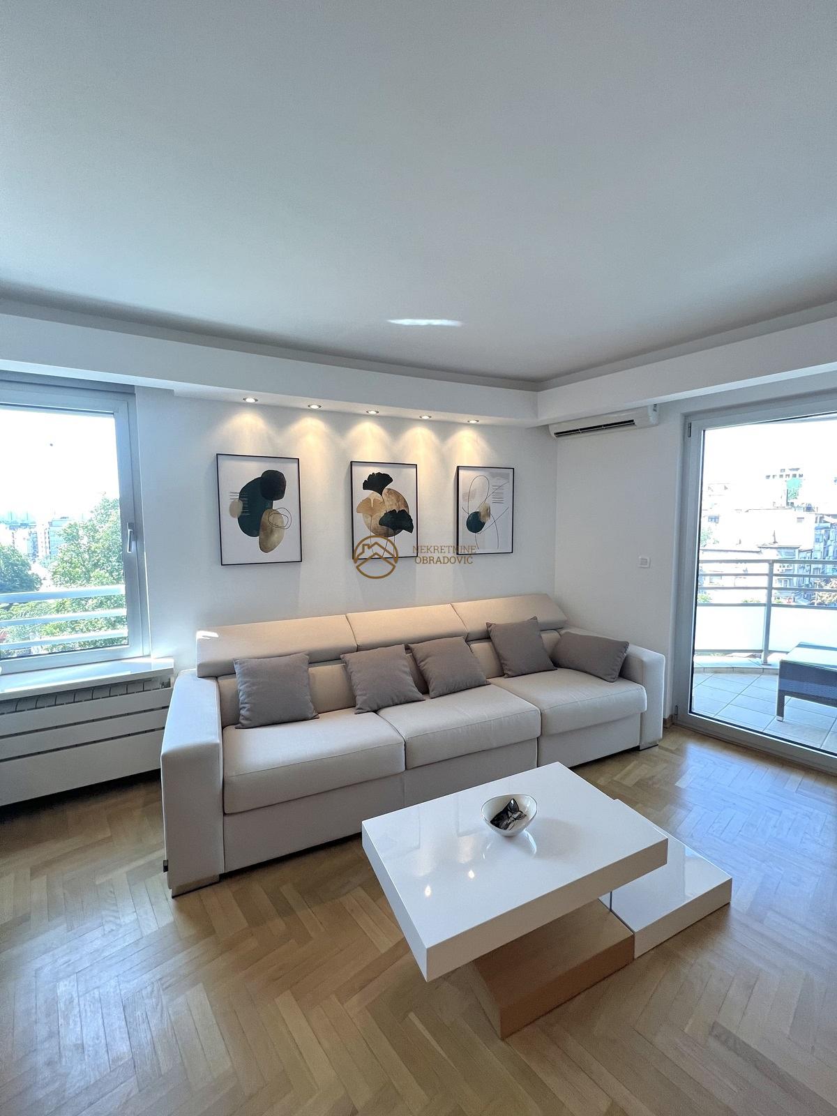 Nalazi u novogradnji iz 2014. godine i stan je u savrseno odrzavanom stanju, koji je minimalno koriscen. Sve u stanu je radjeno po meri i opremljen je najsavremenijim materijalima, tehnikom i aparatima i prodaje se u potpunosti namesten. Nalazi se u veoma kvalitetnoj zgradi, koja poseduje dva lifta, portira 24h i video nadzor. Uknjizen je na 68m2, sastoji se od ulaznog hodnika, kuhinje sa trpezarijom, dnevnog boravka, dve spavace sobe, kupatila, toaleta i terase. Stan je veoma osvetljen, sa odlicnim rasporedom, dvostrano orijentisan i sa pogledom na Hram Svetog Save.