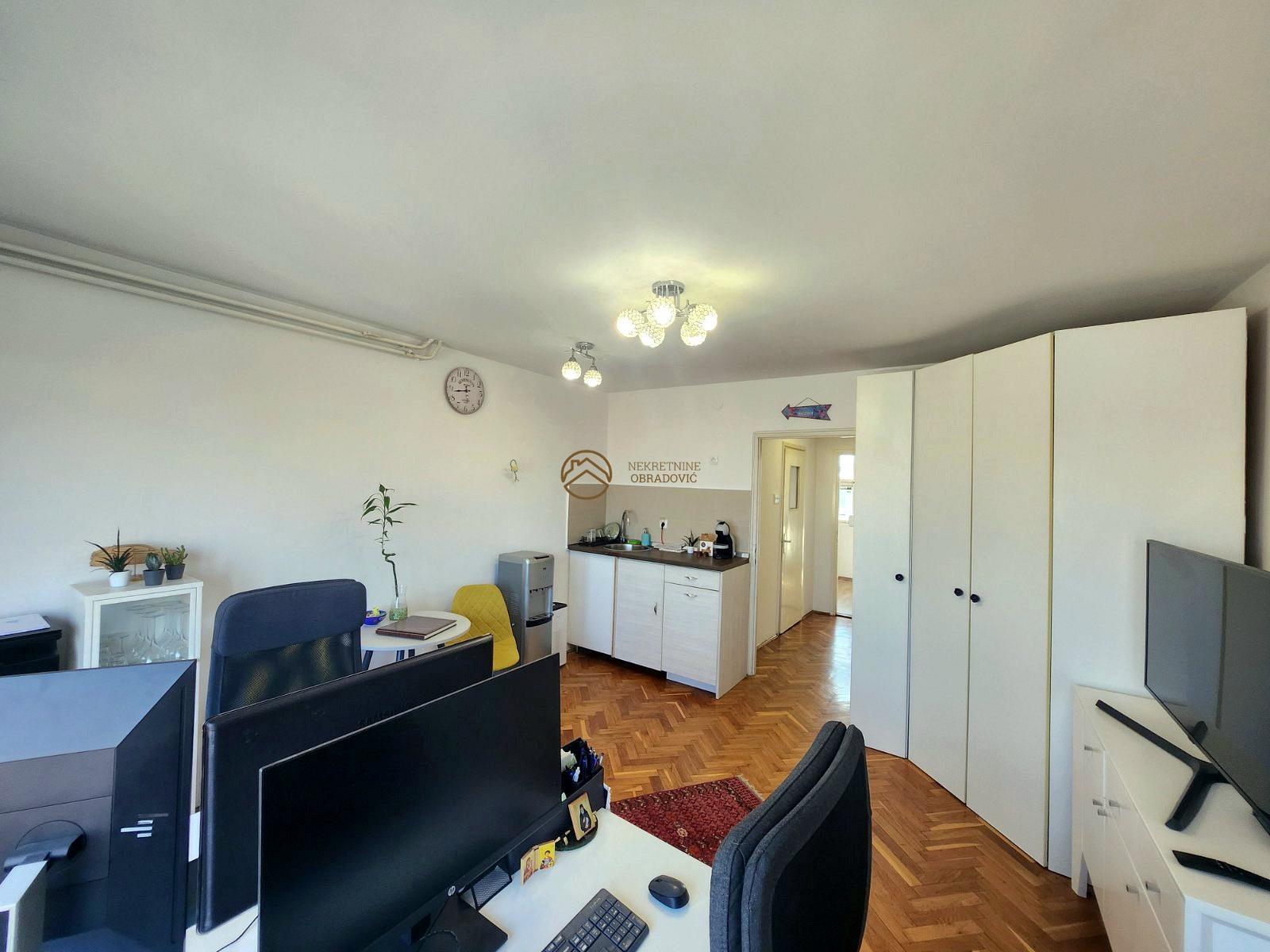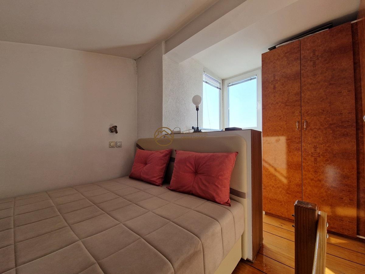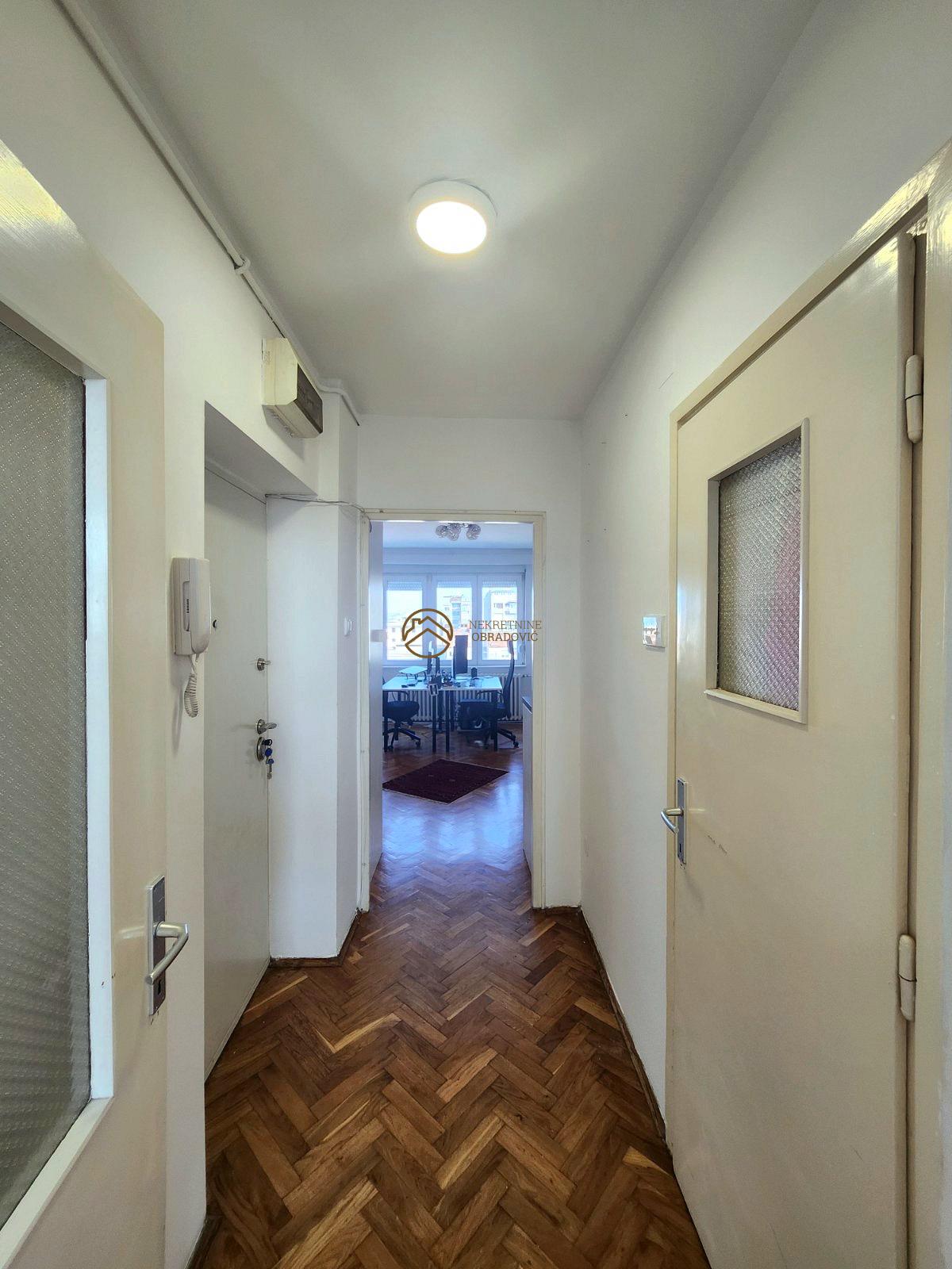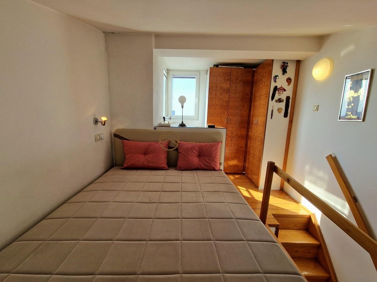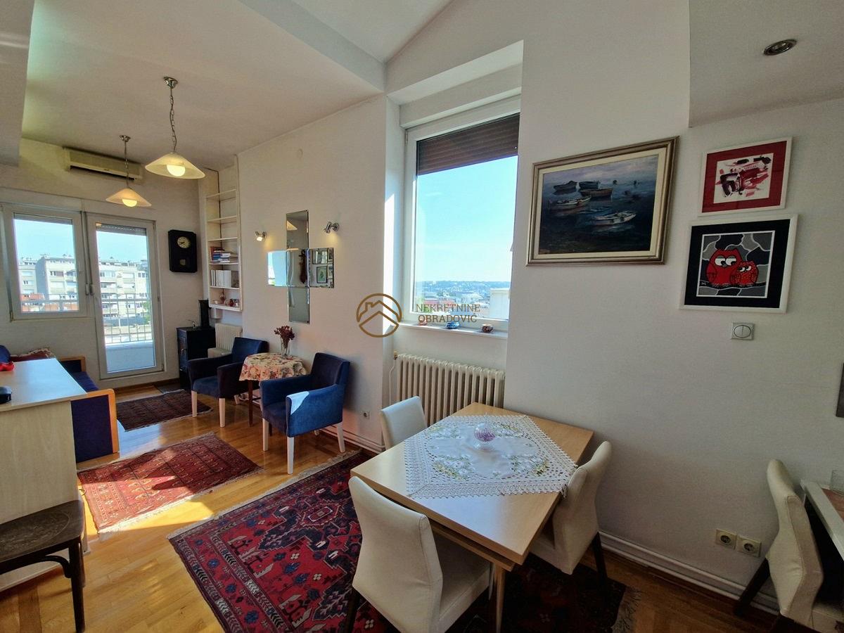 U pitanju je stan dupleks, koji u naravi funkcionise kao dve odvojene stambene jedinice na 8. i 9. originalnom spratu(pripojen tavanski prostor kroz upotrebnu dozvolu i kao takav stan je uknjizen na 56m2).