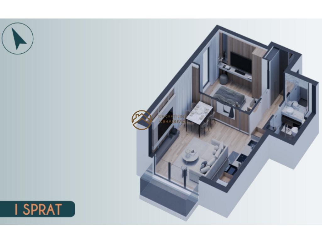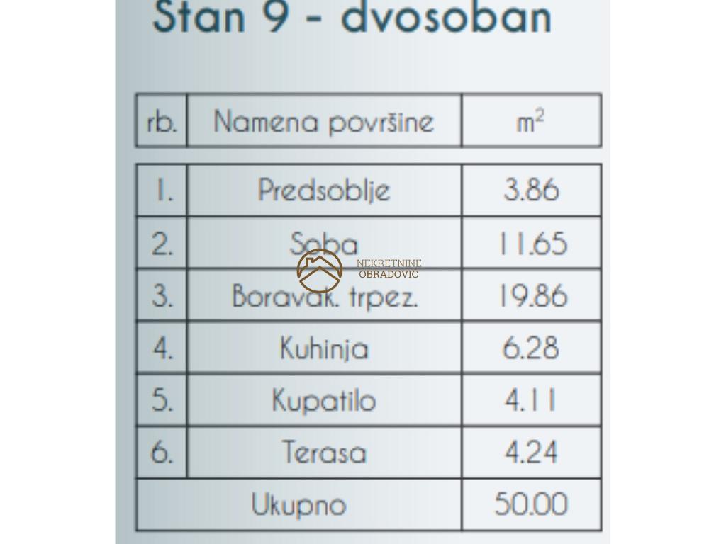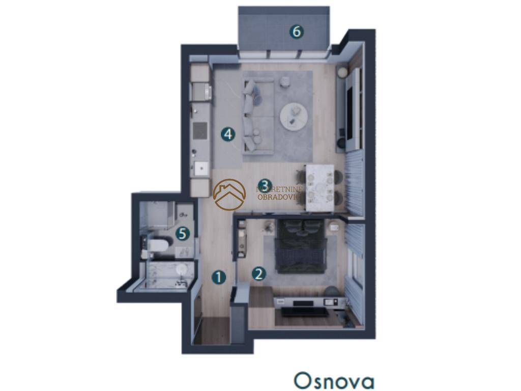 Predsoblje, dnevni boravak sa trpezarijskim delom, kuhinja, spavaca soba, kupatilo, toalet, terasa.