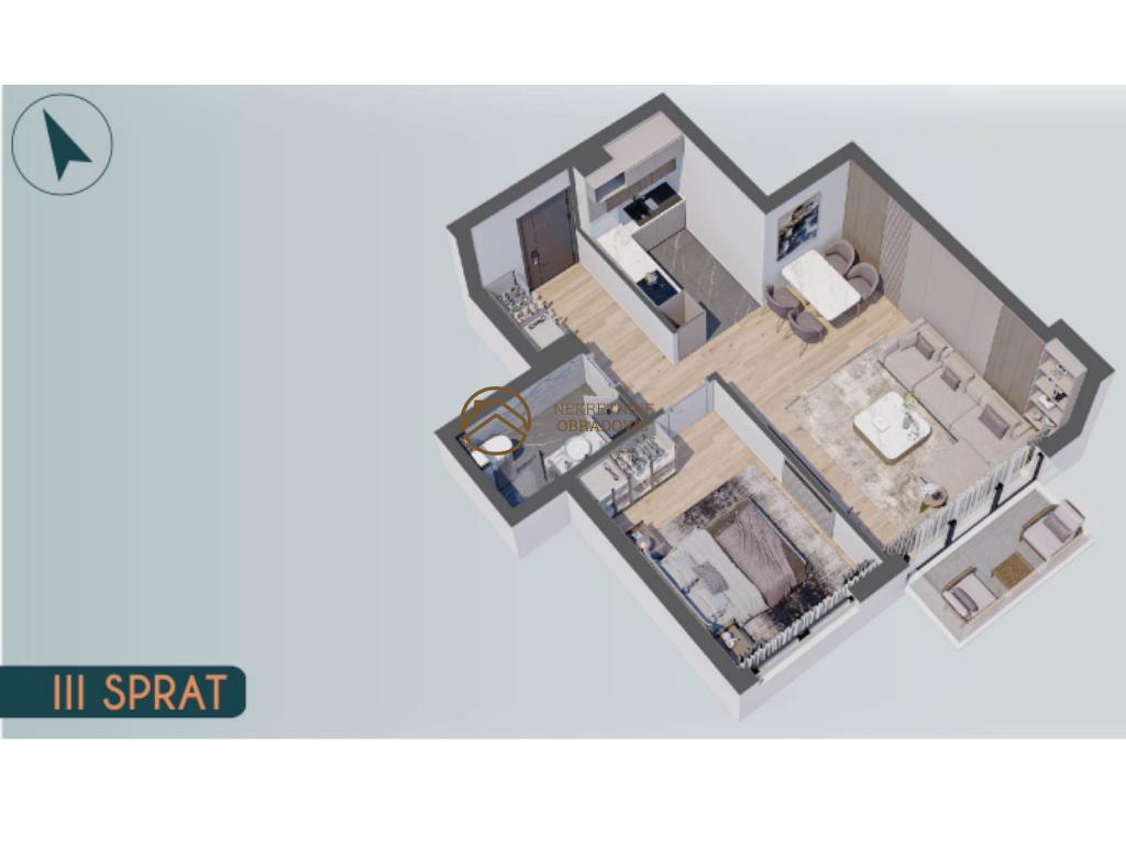 Predsoblje, dnevni boravak sa trpezarijskim delom, kuhinja, spavaca soba , kupatilo, toalet, terasa.
