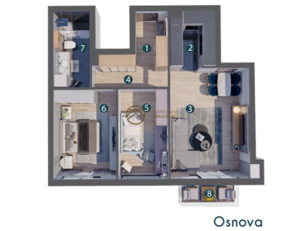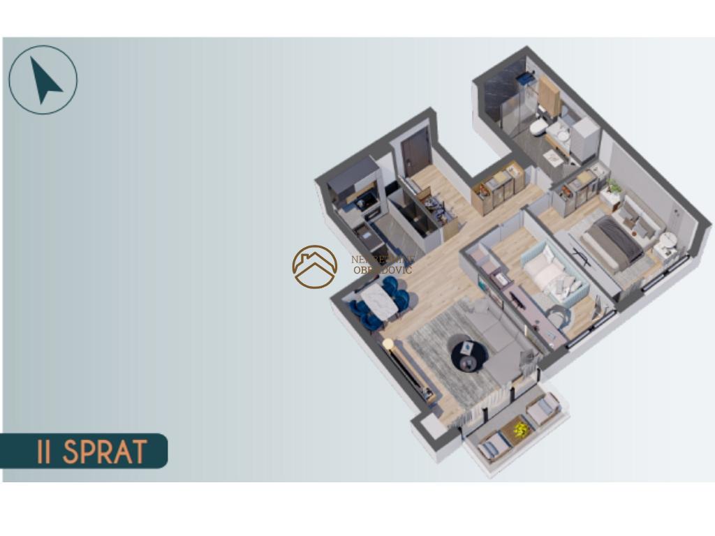 Predsoblje, dnevni boravak sa trpezarijskim delom, kuhinja, dve spavace sobe, kupatilo, toalet, terasa.