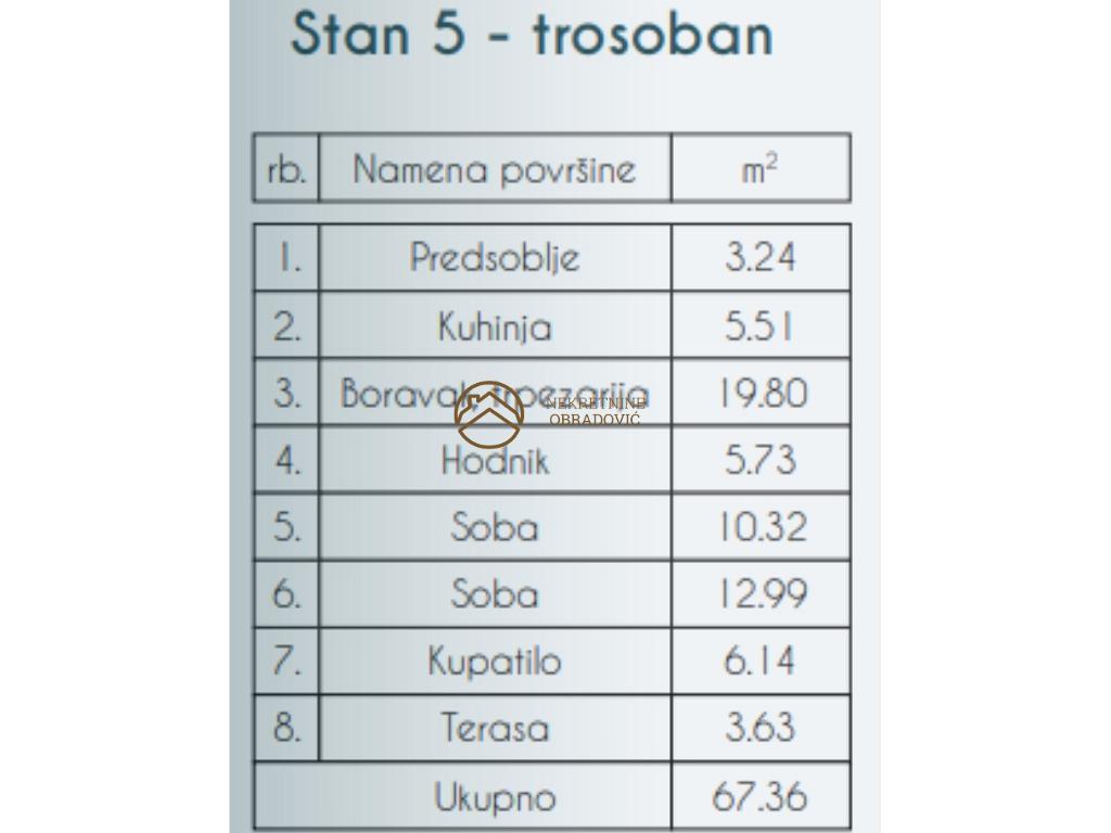 U ponudi je funkcionalan trosoban stan od 67,36m sa terasom na prvom spratu zgrade okruzene zelenilom.