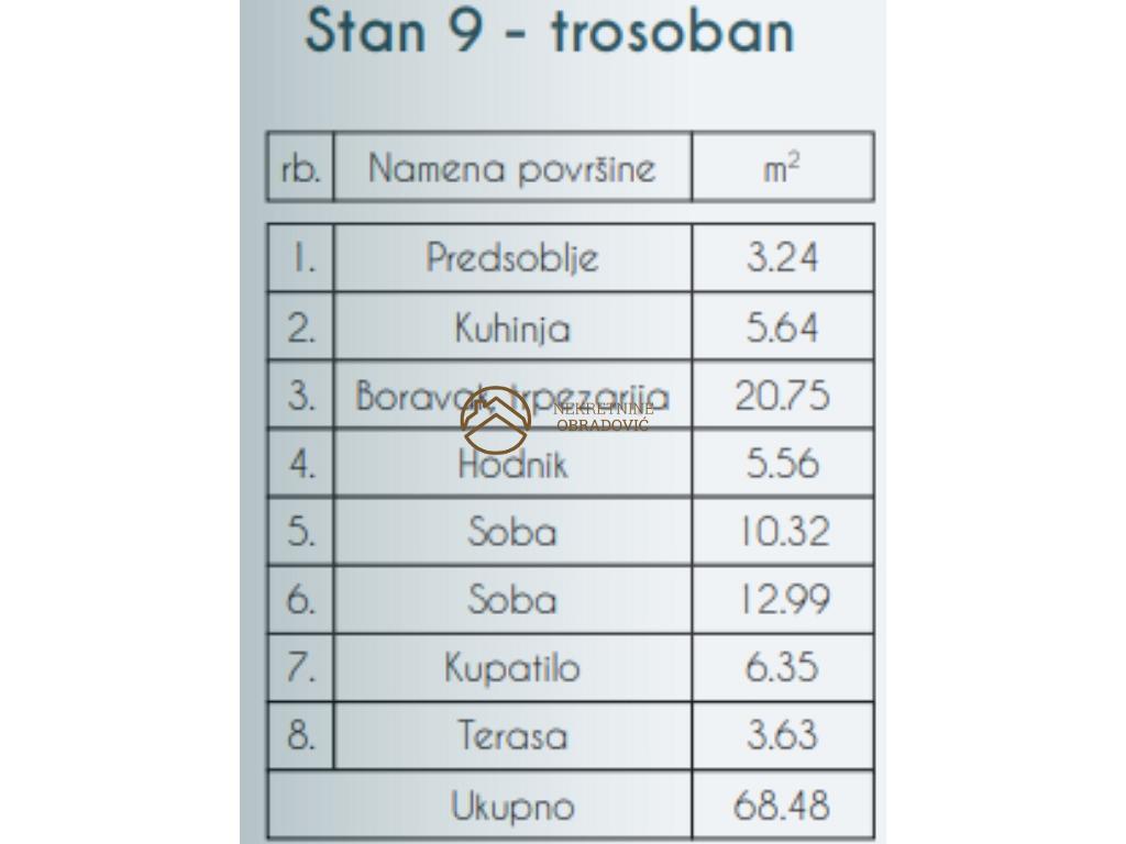 U ponudi je funkcionalan trosoban stan od 68,48m sa terasom na prvom spratu zgrade okruzene zelenilom.
