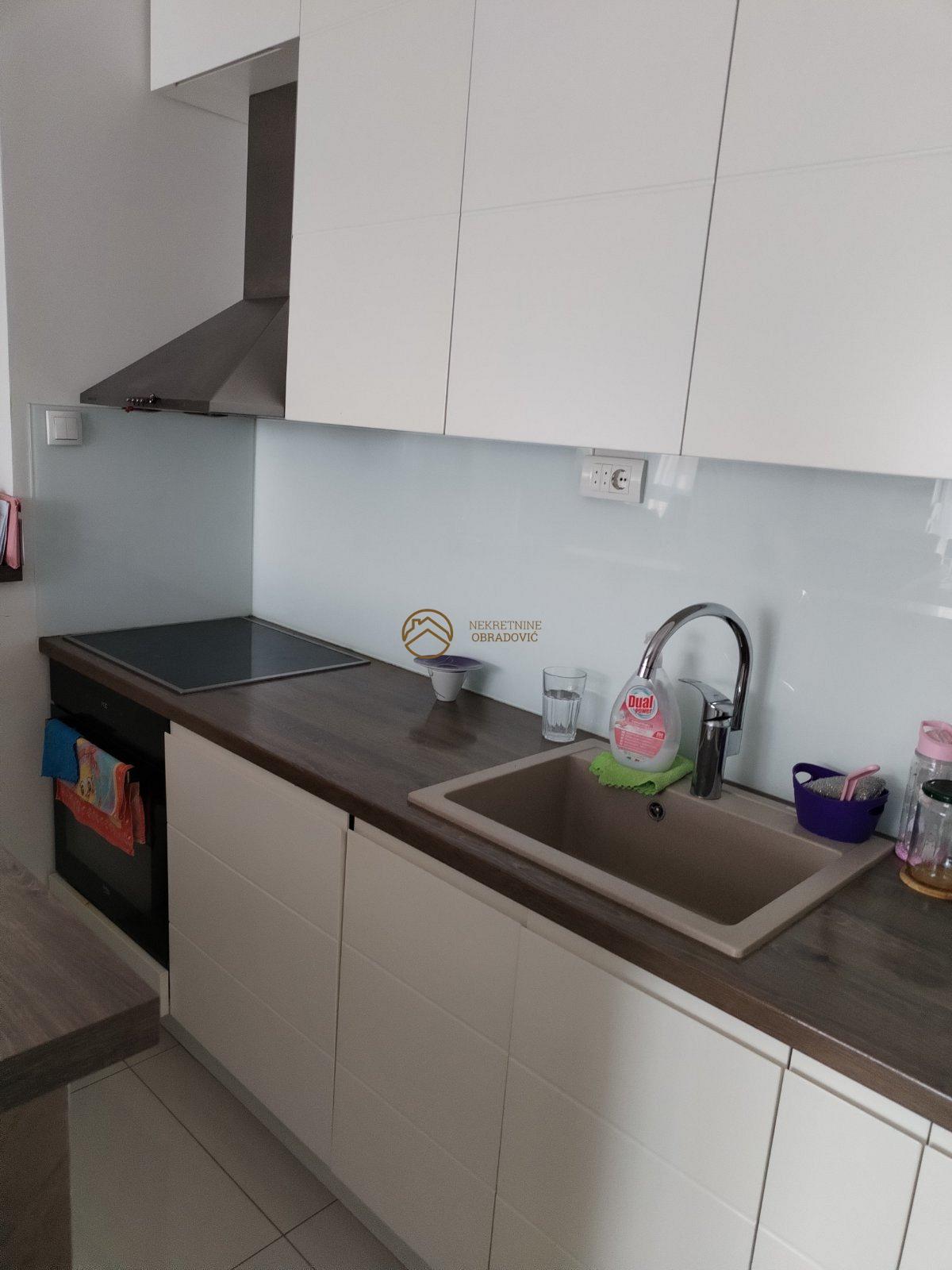 plakari i kuhinja sa belom tehnikom. Stan ima natkriveno pripadajuce parking mesto u