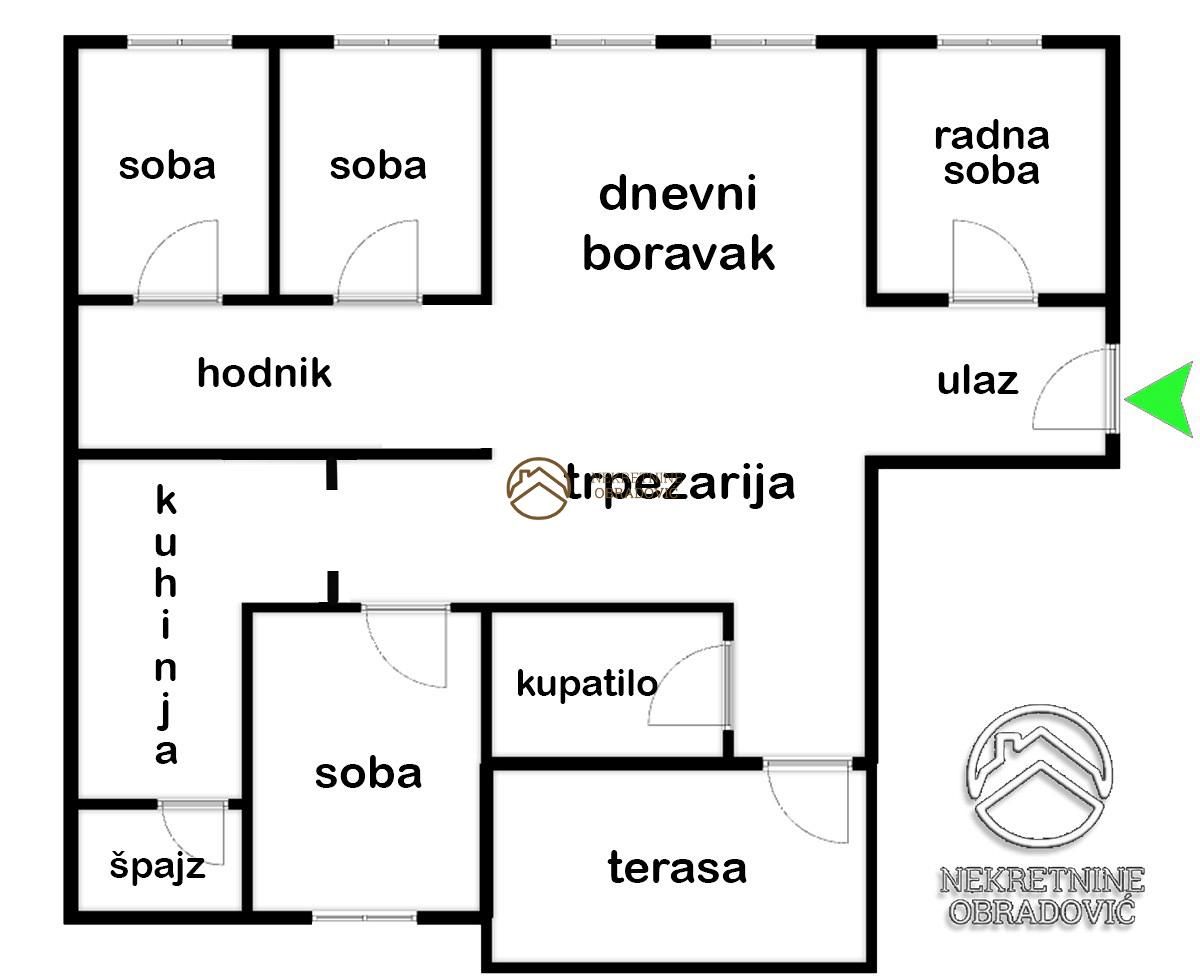 Od prostorija, ova nekretnina poseduje: Predsoblje, kupatilo, kuhinja, dnevni boravak sa trpezarijom, hodnik, tri spavace sobe, radna soba, lodja, ostava.
