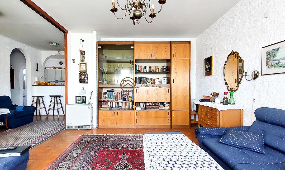 Predsoblje, dnevni boravak, kuhinja, trpezarija, dve spavace sobe, kupatilo, toalet, lodja.