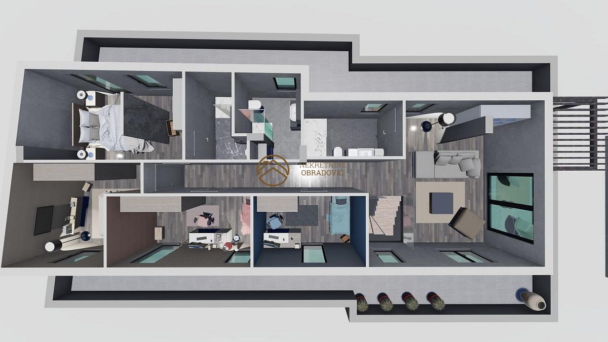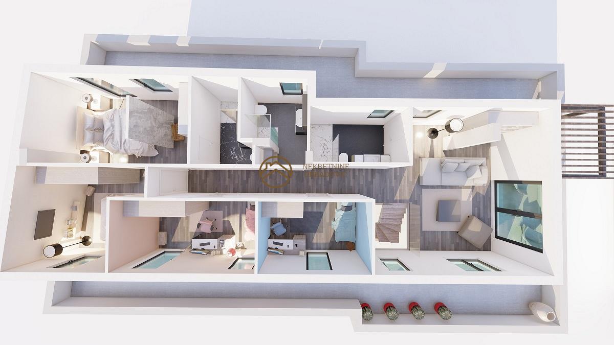 Od prostorija, ova nekretnina poseduje: Nivo I - 62,3,m2 (od cega 6m2 terasa) Nivo II - 176,6m2 (od cega 83m2 terasa) Nivo III - ravan krov iznad stana 100m2 (samo na raspolaganju tom stanu).